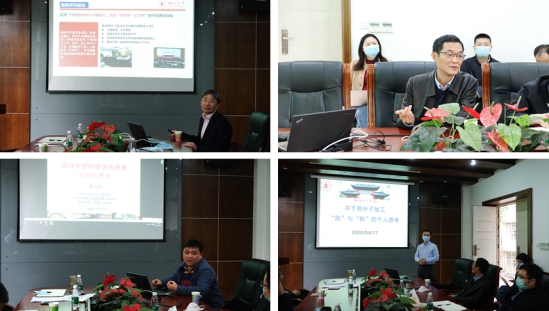 校发展规划处处长李忠明教授向大家介绍学校贯彻落实“文优、理进、工改、医强”的团队建设理念、深入推进学科内涵发展建设、第五轮学科评估以及双一流验收等情况,并对学院学科发展建设提出了建议。党委书记牟德富从国内社会评价、综合评估、人才、科研等方面对学校高分子学科现状进行了分析介绍。科研副经理杨伟介绍了学院近五年科研数据、学院在全校科研排名及国家科研相关新政等内容。青年教师代表李乙文、王宇分别做了题为“高分子材料研究的进展介绍与思考”和“关于高分子加工‘危’与‘机’的个人思考”的报告,介绍了国内外高分子材料方向最新工作进展、分析了当前形势,并对学院发展建设给出相关建议。
