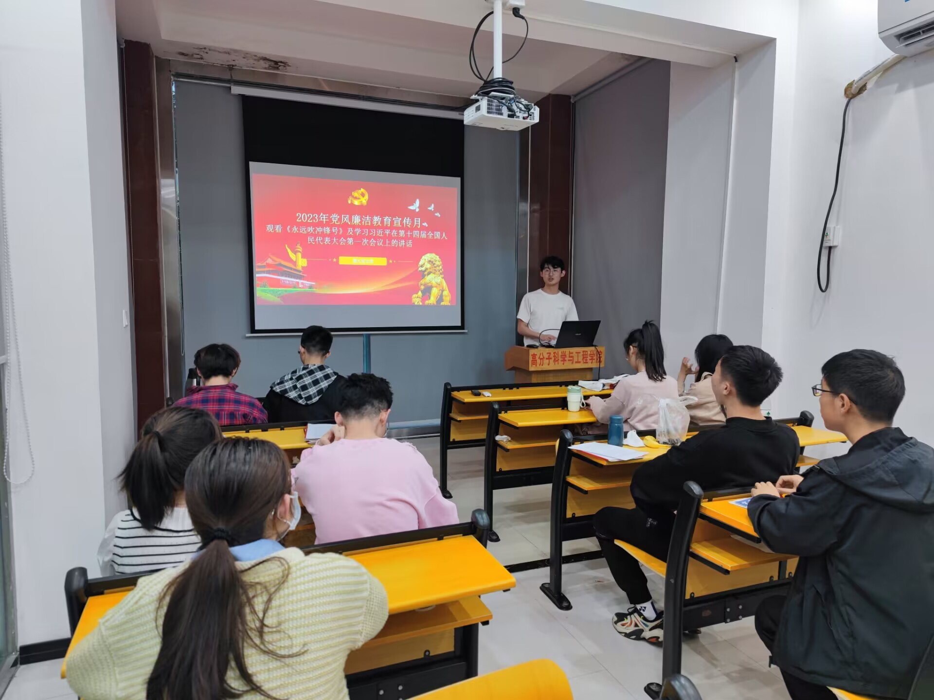 为深入学习贯彻党的二十大精神,落实中共中央及教育部关于高校廉洁教育的指示精神。4月10日晚7点整,金沙js5588材料学科研究生第九党支部在金沙js5588西四教101B会议室开展 “党风廉洁教育宣传”主题党日活动,本次活动由刘炜洁同志主持,胥钊、石乐园和姜力超同志领学。