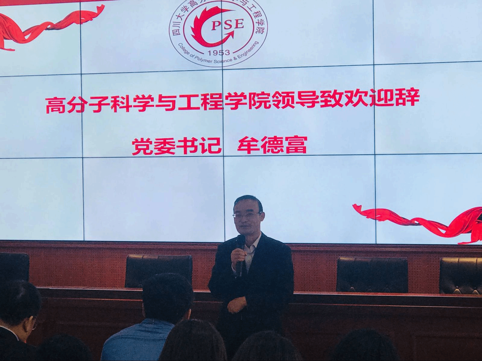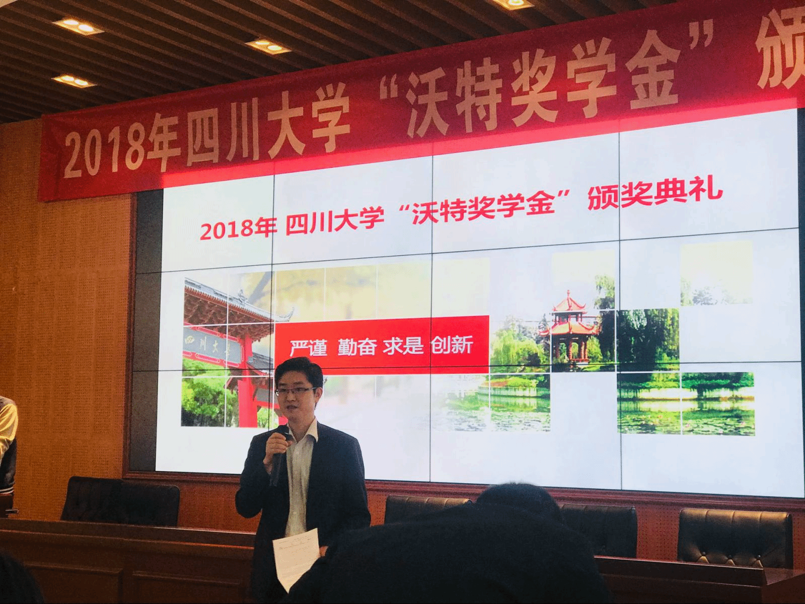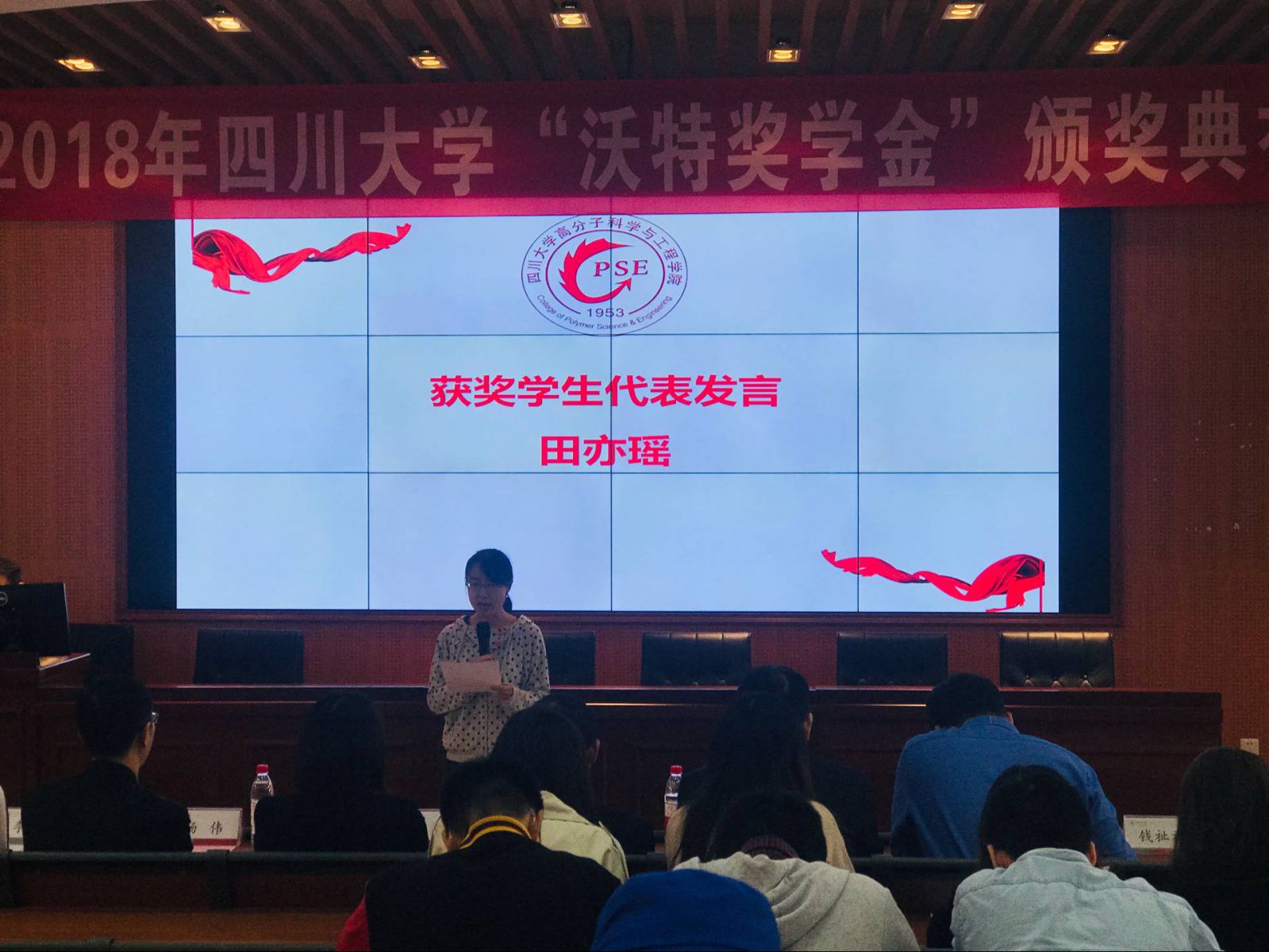 本次颁奖典礼由金沙js5588高分子科学与工程公司党委副书记钱祉祺主持。在介绍了到场嘉宾以及获奖情况后,金沙js5588高分子科学与工程公司党委书记牟德富教授致欢迎词,他首先代表学院感谢深圳市沃特新材料股份有限公司设立“沃特奖学金”。今年是深圳市沃特新材料股份有限公司在学院设立沃特奖学金的第五年,今年深圳市沃特新材料股份有限公司又增加了在川大高分子设立的奖学金,充分体现出沃特公司对川大高分子的重视,作为高材人,在感谢深圳市沃特新材料股份有限公司给予大力支持的同时,更要学习沃特公司的核心理念,要从校园开始就形成诚信与感恩的良好品质,将其带入社会浪潮中,并伴随自己的一生。