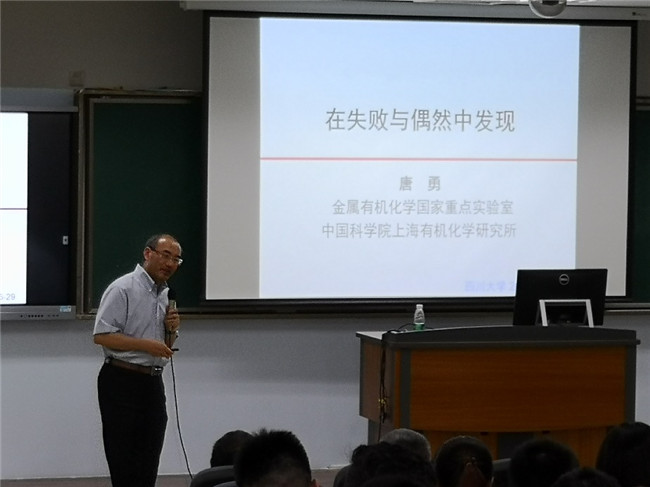 唐勇院士从人类文明切入,展示了化学在人类生活衣食住行等多个方面的重要性。他指出,化学正在通过微观分子影响和改变着宏观世界,合成化学家的任务则是创制影响和改变世界的分子。众多合成化学家在将近一个世纪的努力中,创造了许多重要的有机反应,其中很多都是在积累的基础上的偶然发现。唐勇院士还以自己的经历鼓励广大研究生在做研究的过程中找到自己的兴趣,并将其作为自己的事业,必定会有一番成就。在报告的最后,唐勇院士表示在做科学研究的实践中,失败和偶然是重要发现的信号灯,是成功的前奏;在人生的道路上,失败和挫折将为自己的人生目标和定位提供重要的机遇。报告结束后,唐勇院士就老师和同学在学院专业课程设置、文章与专利间处理、遇到无法继续的课题及师生相处等方面的问题表达了独到见解。通过本次学术报告交流,参会师生受益颇多。