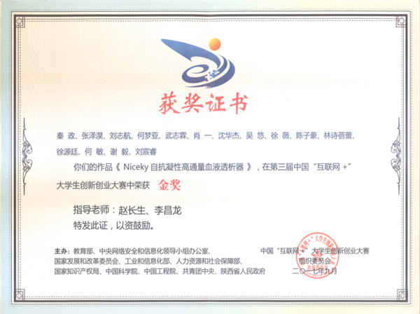 据悉,2017年9月18日,第三届中国“互联网+”老员工创新创业大赛全国总决赛在西安电子科技大学圆满落幕。经过激烈角逐,公司赵长生教授指导的作品“Niceky自抗凝性高通量血液透析器”斩获金奖。金奖项目团队指导教师赵长生教授荣获“优秀创新创业导师奖”。