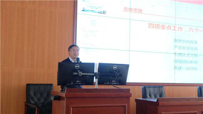公司经理傅强教授代表党政领导班子布置2018年新学年工作。他指出,学院要深入学习贯彻习近平新时代中国特色社会主义思想和党的十九大、十九届三中全会、两会精神;全面加强党建工作,将从严治党不断引向纵深;全面加快推进“双一流”建设步伐;探索二级学院管理体制改革四项重点工作,围绕聚焦机构改革、严抓安全环保、引育人才人物、增强国际影响等方面,推动学院“六个一流”建设。重点提出了关于人才队伍总体数量少、自培少、引进少、80后储备力量不足,一条龙导师制的评估和完善,科研经费持续提升,ESI学科排名稳定向前,管理作风和效率提高等方面问题的思考。