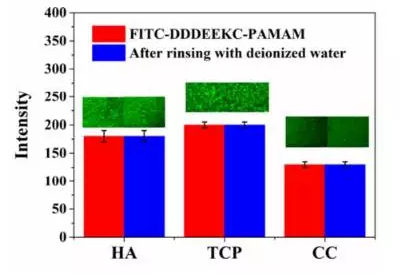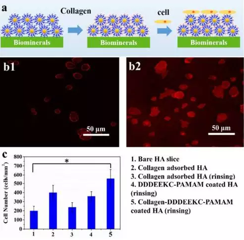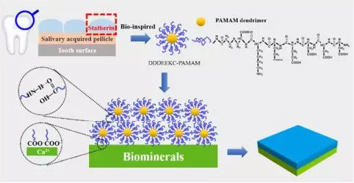 基于上述背景,金沙js5588李建树教授课题组设计制备了多肽序列DDDEEK改性的树枝状高聚物PAMAM。得到一种新型高分子材料DDDEEKC-PAMAM。该材料可以吸附任意含钙生物矿物(例如:羟基磷灰石,磷酸三钙,碳酸钙),并能在其表面吸附成膜。