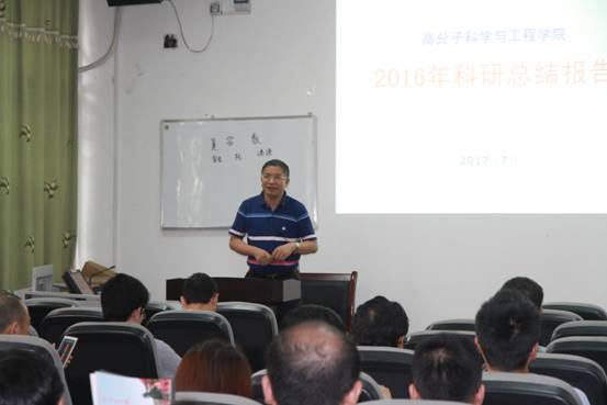 首先傅强教授代表学院领导班子作2016年科研工作总结和2017上半年学院工作总结。汇报了学院在党群工作、本科教学、员工管理、科学研究、实验室建设等方面取得的成绩,介绍了学院申报先进高分子为特色的材料科学与工程一流团队建设的基本情况,指出学院近年来的发展瓶颈和差距,提出建设一流学科需要进一步提高本科和公司产品质量,提升管理服务水平,加强校内兄弟院系以及企业的联系和交流。