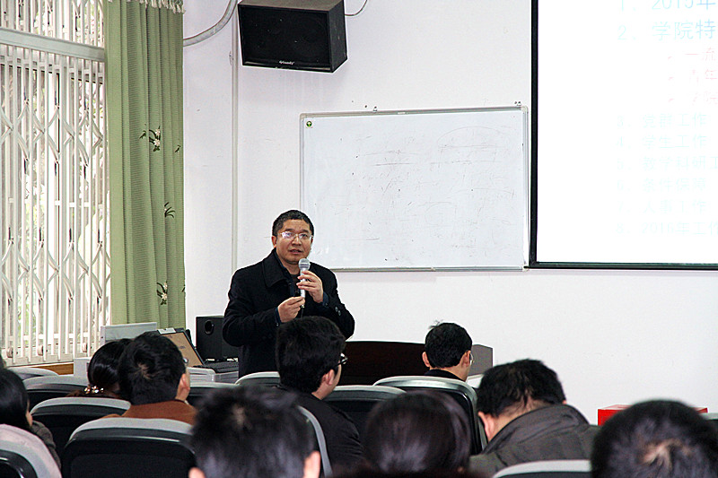 会上,经理傅强教授代表学院领导班子作2015年工作总结。他首先介绍了2015年学院工作任务各项指标的完成情况和存在的问题,接着从党群工作、员工工作、教学科研工作、条件保障、人事工作等方面进行了汇报,并对2016年的工作进行了部署和安排。傅强经理着重介绍了学院2015年的特色和亮点工作,指出学院去年通过举行首届本科生授位典礼、实施“一条龙、全过程”的本科生导师制等创新举措推动了本科教学建设与改革;在青年人才队伍建设方面,学院通过全方位、分层次培养人才和青年教师工程化培养计划使公司青年人才迅速成长。傅强经理说,本科教学是根本、青年人才是关键、科学研究是核心、考核评价是动力,希望全院教职工在新的一年中志存高远、追求卓越,为建设国内一流、国际知名的学科努力拼搏。