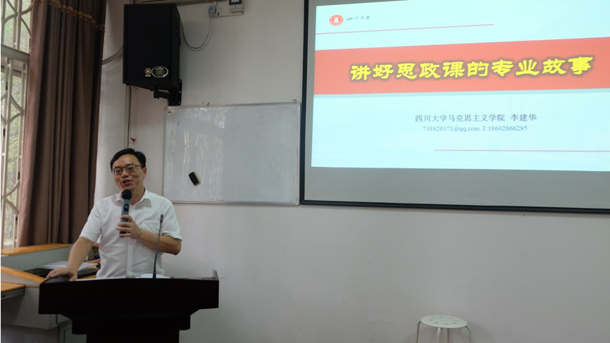 会上,首先由马克思主义学院副经理李建华给我们带来题为“讲好思政课的专业故事”的报告,李教授指出可以将张澜、吴玉章、徐僖等大师的故事融入课堂中,在课程中实现思政教育,每门课程都应该担当立德树人的作用;作为新时代的大学教师,我们的使命和任务,就是担当民族复兴大任,立德树人,科研强校,科技报国。从李教授的报告中,我们深受鼓舞与激发,同时也学会了如何将思政与课程有机融合的方法,是一场非常有意义的报告。
