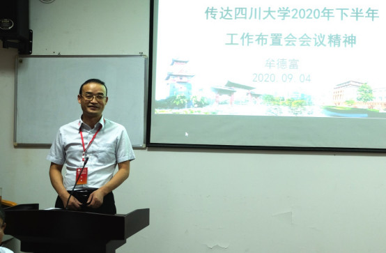 会上,党委书记牟德富传达学校下半年工作布置会精神,并提出学院下一步努力的方向。他强调,面对第五轮学科评估和“双一流”建设一期验收两场大考,我们应充分认识到目前所面临的机遇和挑战,全体教职工要增强大局意识、勇于担当作为、狠抓工作落实,拼搏实干、砥砺奋进、追求卓越,找准学科的定位与方向,着力提升学科的核心竞争力,不断开创学院事业发展新局面,推动高分子学科再上新台阶。