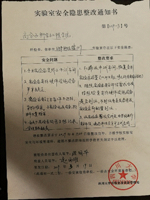 (5)3月19日设备处给公司下发了中试实验室(纳米科技类109)整改通知书(附件5),关停中试实验室,限期1个月整改完成;目前,中试实验室的大部分试剂和杂物已经清理完毕,下一步将报废中试设备,重新改造中试实验室。
