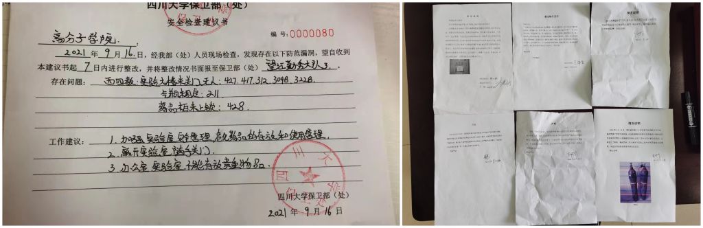 (2)9月16日,保卫处向我们学院下发了“安全检查建议书”(附件2)。相关实验室由安全负责人跟进,及时进行了整改,并上交了整改报告(附件2)。