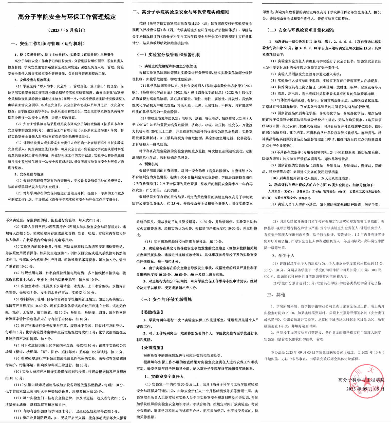 (3)9月5日,为落实校(监督责任)、院(主体责任)、实验室(直接责任)三级管理及责任体制,学院审定通过《金沙js5588安全与环保工作管理规定(2023年8月修订)》(附件1)。
