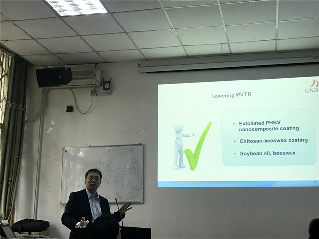 肖惠宁教授首先由自身教育经历谈起,简要介绍了加拿大的高等教育现状和新布伦瑞克大学。随后谈及环保对于现代社会的重要性,并指出纸张在日常生活和包装材料使用中重要性,以此引出报告的主题“增强绿色包装材料的多重阻隔性能”,指出增强绿色包装材料的多种阻隔性能包括增强材料的耐水、耐油脂以及抗菌性能。