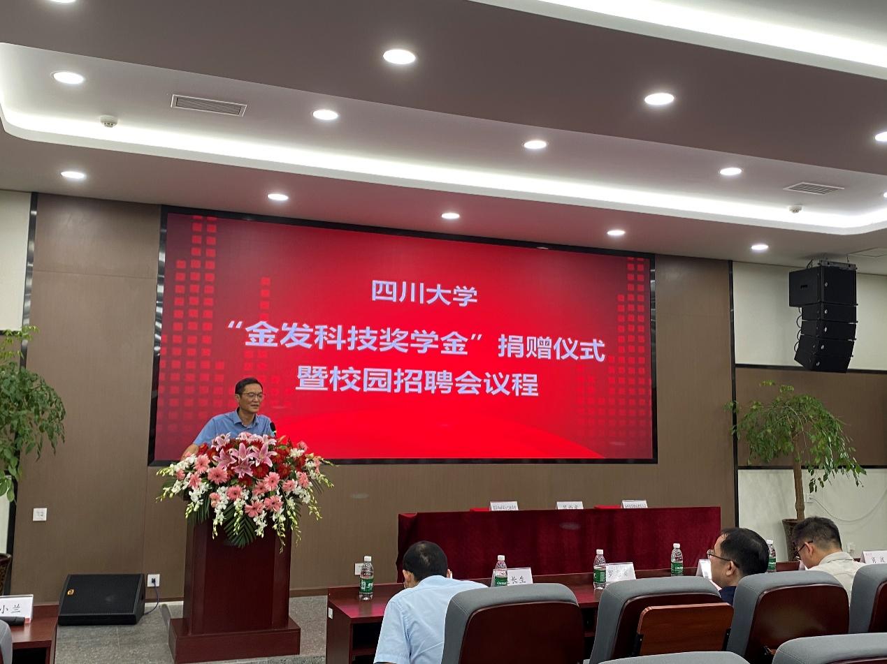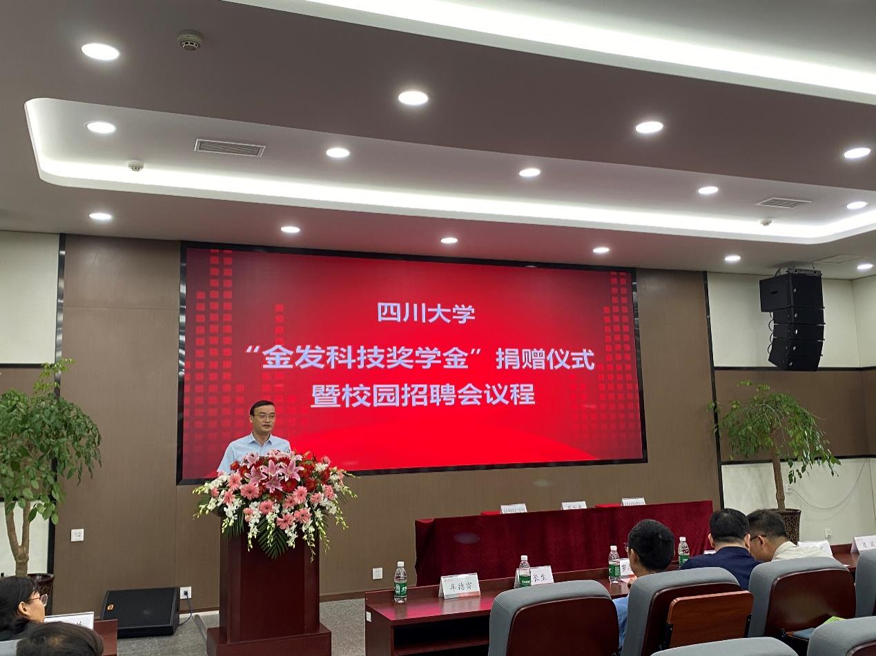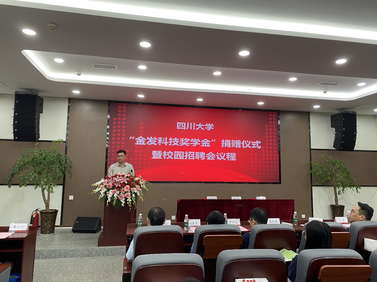 9月25日下午,金沙js5588“金发科技奖学金”捐赠仪式在学院科教楼209报告厅隆重举行。金发科技华西公司总经理沈红波、副总经理罗忠富、总经理助理兼华西运营部部长雷岳文、人事行政部部长黄小兰,公司党委书记牟德富、学院经理赵长生、公司党委副书记钱祉祺,化学公司党委副书记肖波,以及学院员工代表等出席了本次活动。仪式由公司党委书记牟德富主持。