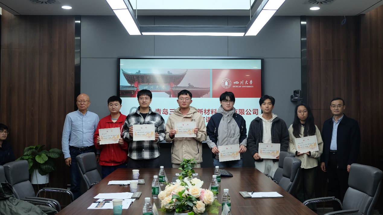 11月20日下午,学院“晓光奖助学金”颁奖典礼在学院科教楼207会议室举行。青岛三力本诺新材料股份有限公司董事长王晓光和成都欣华源科技有限责任公司(三力本诺全资子公司)办公室主任陈瀚,公司党委书记牟德富、党委副书记钱祉祺,学校分析测试中心教授杨杰、王孝军以及学院员工工作组辅导员、获奖员工代等出席颁奖仪式。颁奖仪式由公司党委副书记钱祉祺主持。