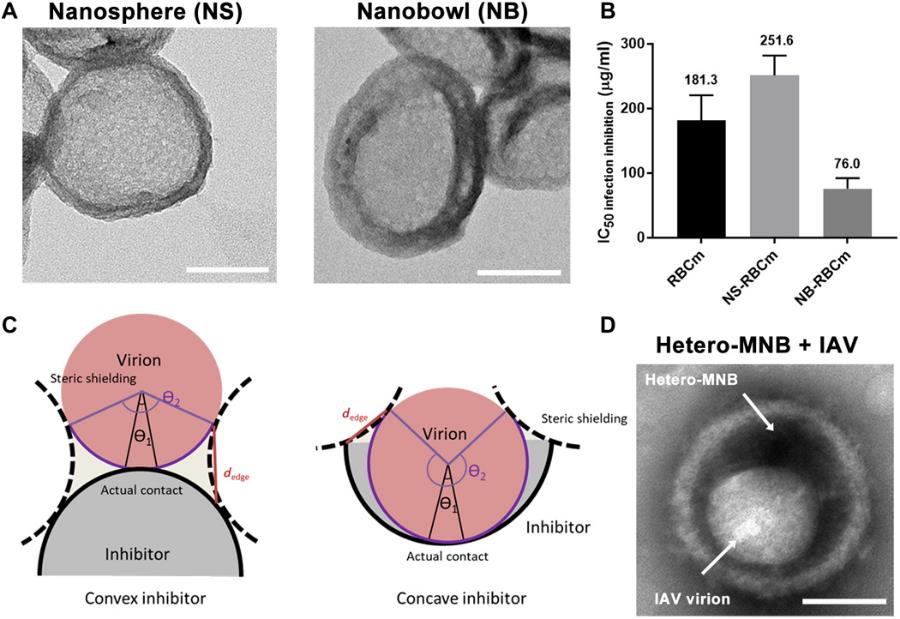 在此基础上,通过将该高分子异质多价结构与拓扑结构相结合,将其均匀包覆在碗状纳米颗粒表面,构建出具有与流感病毒形貌匹配的异质多价拓扑纳米结构。由于流感病毒粒子大多是一个直径约100 nm的纳米球体,在合成中,选择了一个约120 nm的凹形碗状结构来匹配及增加多价键相互作用。该碗状结构NB-RBCm对病毒的IC50抑制值约为球型结构NS-RBCm的4倍。通过模型计算,在凸型抑制剂(NS)的情况下,病毒粒子可以通过爬行和滑动释放,而凹形碗状结构强的空间屏蔽和小的边缘距离使得多价作用更加稳定,从而表现出比凸型更好的病毒抑制能力。