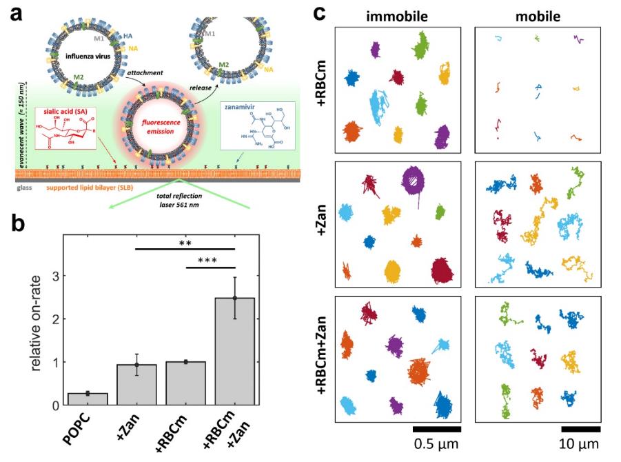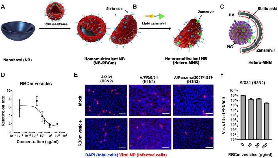 近年来,除了刺状纳米结构,开发具有其他拓扑匹配结构的多价高分子纳米抑制剂被认为将进一步增加抑制剂对病毒的结合和中和效率。在本工作中,研究团队基于人体红细胞膜作为基材,开发出具有唾液酸与zanamivir双重特异性结合能力的异质多价结构。全内反射荧光显微镜的观察显示zanamivir的引入显著提高了红细胞膜对流感病毒的结合能力,流感病毒附着在异质多价结构表面的比率比同质多价表面高出三倍。