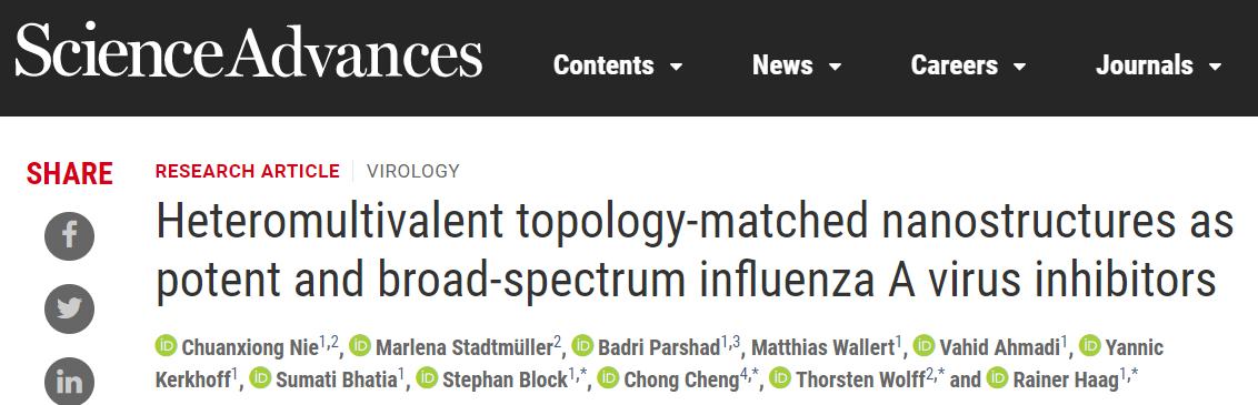 近日,公司程冲研究员团队联合德国柏林自由大学Rainer Haag教授等研究人员在高分子基病毒抑制剂领域取得的重要研究成果,相关研究已经在国际顶级期刊Science Advances在线发表(Heteromultivalent topology-matched nanostructures as potent and broad-spectrum influenza A virus inhibitors)。该合作团队报道了一种具有拓扑匹配结构的新型多价高分子纳米制剂,其可实现高效广谱的抑制流感病毒。相对于传统的抑制剂,该多价纳米制剂对病毒的抑制浓度可低至32.4±13.7 μg/mL,并可以减少99.99%的病毒传播。由于在新冠病毒也具有类似的结构,研究团队预期该研究结果将有助于新冠病毒高分子抑制剂的研发。论文的第一作者为公司优秀硕士毕业生聂川雄,现为柏林自由大学博士后。