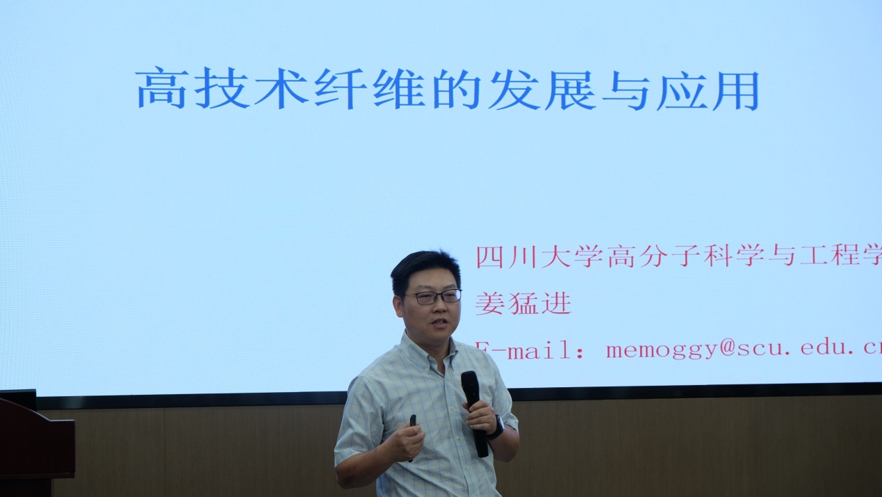 高材系姜猛进教授给同学们作了题为“高技术纤维的发展与应用”的科普讲座,重点介绍我国化学纤维的发展现状、高技术纤维高性能化和超细化发展方向等。同时,姜老师给同学们展示了三种不同的化学纤维,让同学们切实感受不同材料的不同性能,拓展了同学们的科学视野。