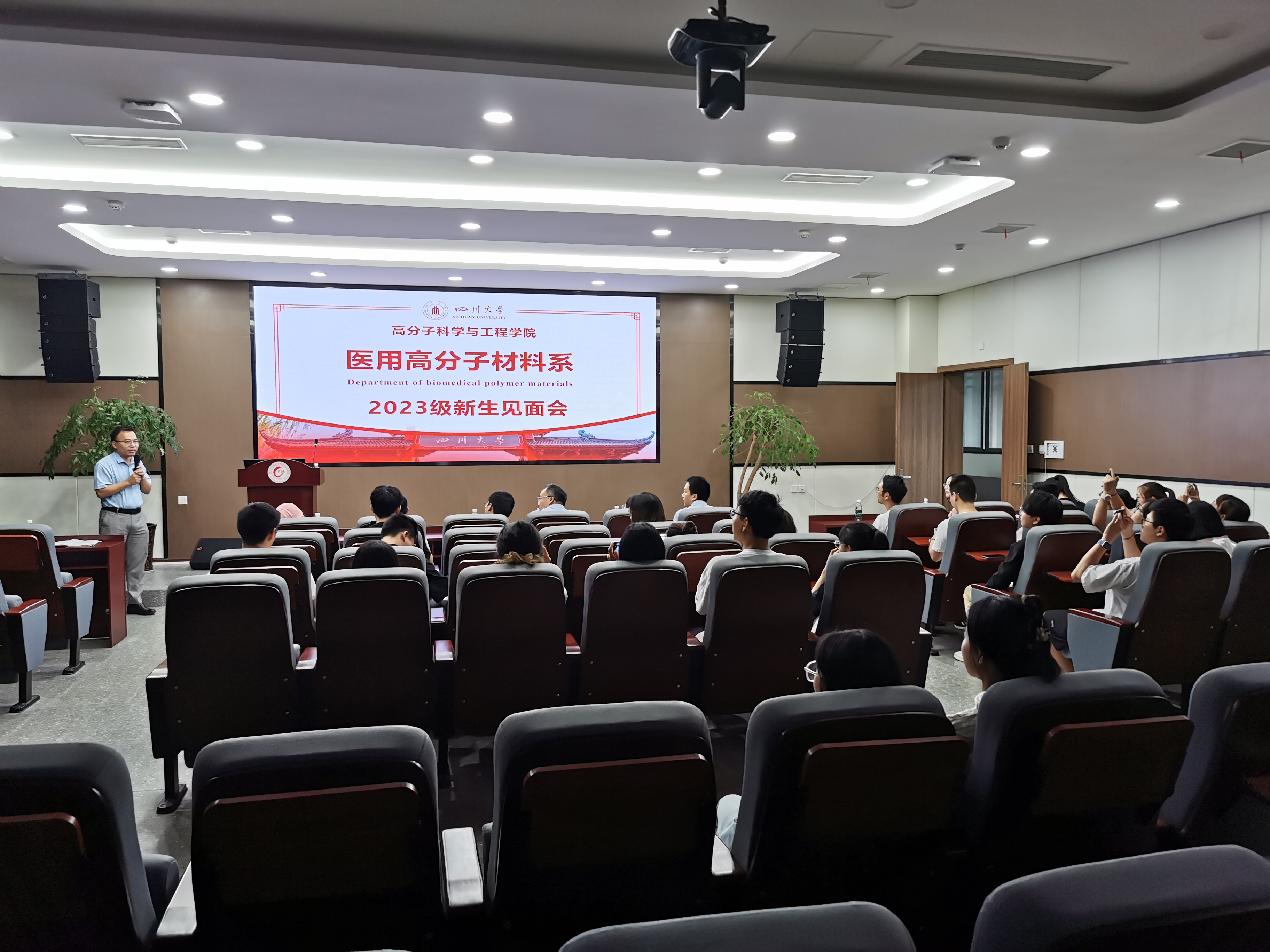 医用高分子材料系主任丁明明教授发言。他对2023级52名新同学表示热烈欢迎,并就本系发展沿革、团队队伍结构、科研成果及杰出员工等情况进行了详细介绍,鼓励同学们向优秀的老师和前辈学习,成长为高素质复合型人才。