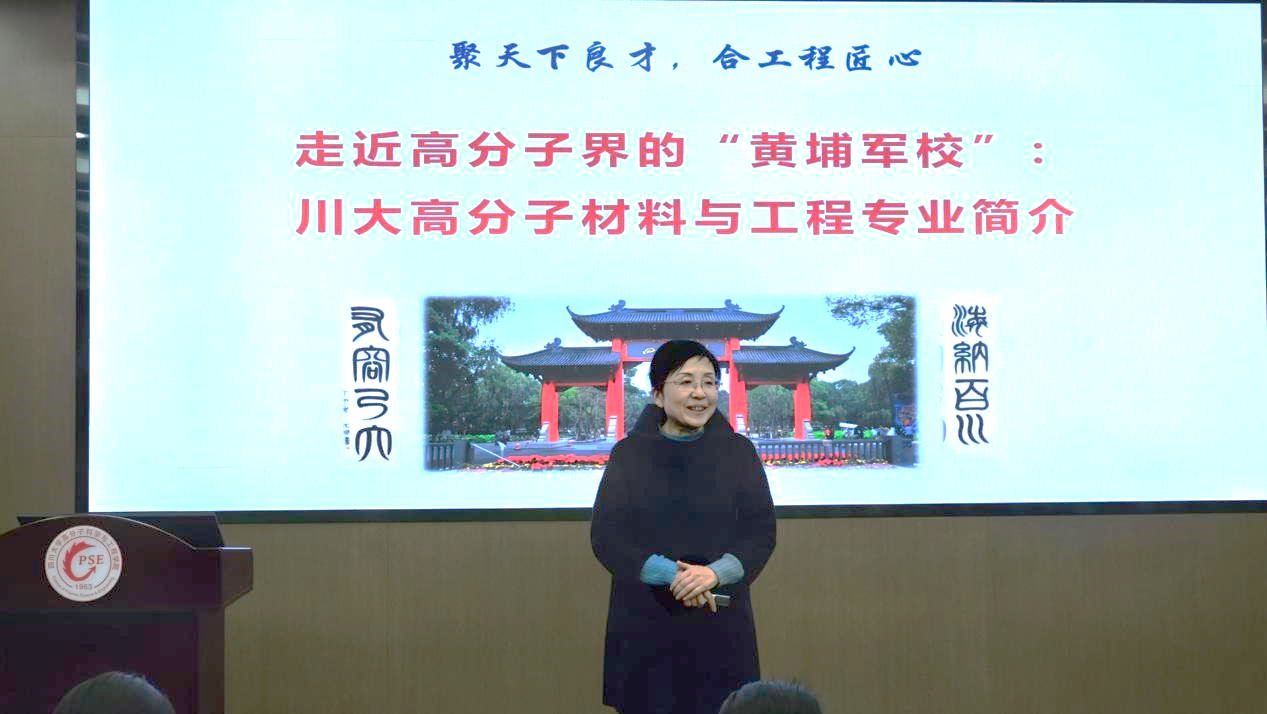 活动开始,同学们通过视频了解了川大高分子学科奠基人徐僖院士的生平和他对高分子学科的卓越贡献。随后学院副经理冉蓉从历史沿革、学科现状和未来发展这三个方面,详细介绍了金沙js5588的建立与发展、人才培养模式以及取得的教学科研成果等,并表示欢迎同学们以后报考金沙js5588。