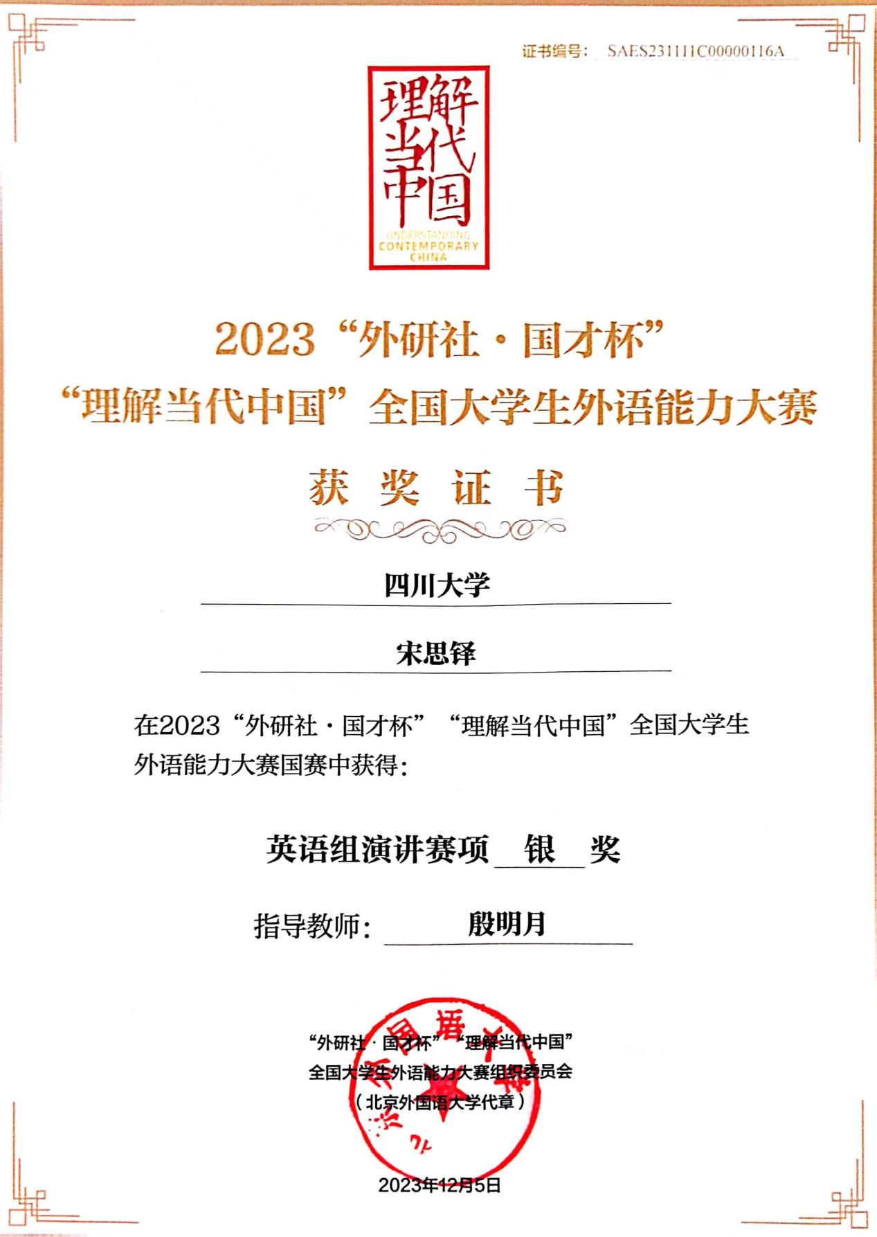 在金沙js5588校赛中,宋思铎作为唯一入围校赛的工科员工,在外国语学院殷明月老师指导下,历经五轮比赛,耗时整整两个月,凭借出色的表现先后获得校赛特等奖(第一名)、四川省省赛金奖(第三名),最终在全国决赛中荣获银奖。