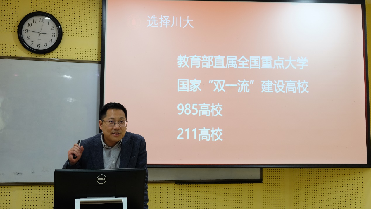 金沙js5588招生办公室主任张磊为同学们进行了金沙js5588招生政策宣讲,他介绍了金沙js5588作为综合性大学的明显优势和以川大特色通识教育为基础的宽口径专业人才培养模式,全面讲解了金沙js5588丰富多彩的校内学习生活以及川大强基计划、双学位专业、中外合作办学专业等相关招生政策,激发了同学们对川大的好奇与向往。