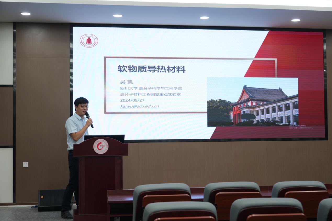 吴凯做了题为“软物质导热材料”的报告。报告以本征高导热聚合物纤维及厚材、新概念胶体状液态金属以及应用探索三个方面为出发点,探讨了导热材料在温度梯度场下从热端向冷端传递热量,具有高效传递热量的特点。传统导热材料如金属、石墨和陶瓷具有有序的晶格结构,导热性能高;而软物质导热材料如聚合物和胶体材料则具有低模量和良好的柔韧性,但导热性能较低。研究团队通过调控聚合物的过渡区,制备了高导热纤维,发展了基于连续纤维的加工方法。此外,研究团队利用化学方法,构筑了具有梯度结构的陶瓷-液态胶体界面,解决了界面传热问题。以上工作显著提升了液态金属陶瓷胶体材料的低热阻,应用于高热流密度电子器件的散热,效果显著。通过探索软物质导热材料的应用,解决了千瓦级、大面积超高热流密度装备的散热难题,并实现在相控阵雷达中的初步应用。