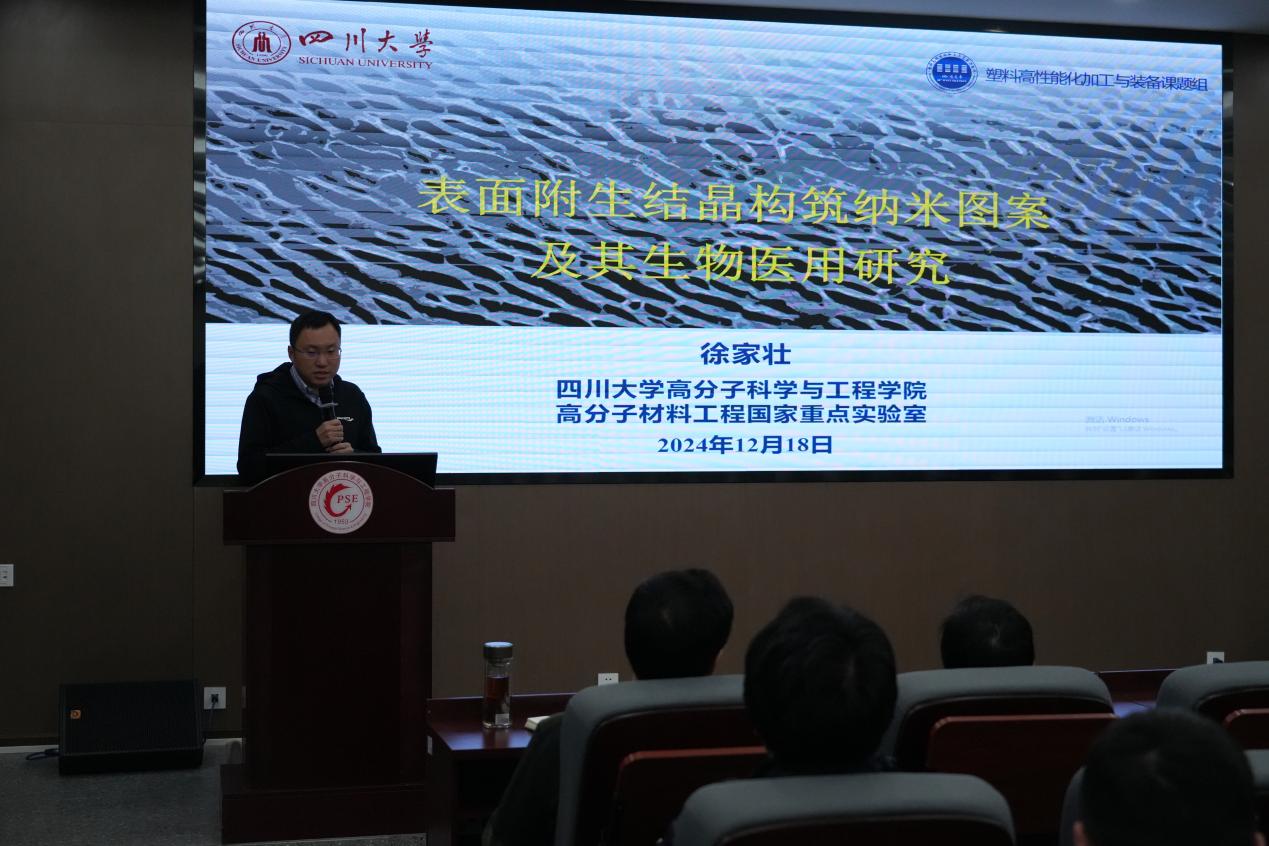 徐家壮老师作了题为“表面附生结晶构筑纳米图案及其生物医用研究”的报告。他介绍了基于表面附生结晶在高分子材料表面构建纳米图案的方法,探讨了如何有效调控表面纳米图案的形貌。还分享了基于附生结晶构筑的表面纳米图案对细胞行为和促进成骨分化的研究进展。并以附生结晶构筑的表面纳米图案为底层技术,进一步实现了高分子支架表面的多功能化,为新型生物医用材料的加工提供了新思路。