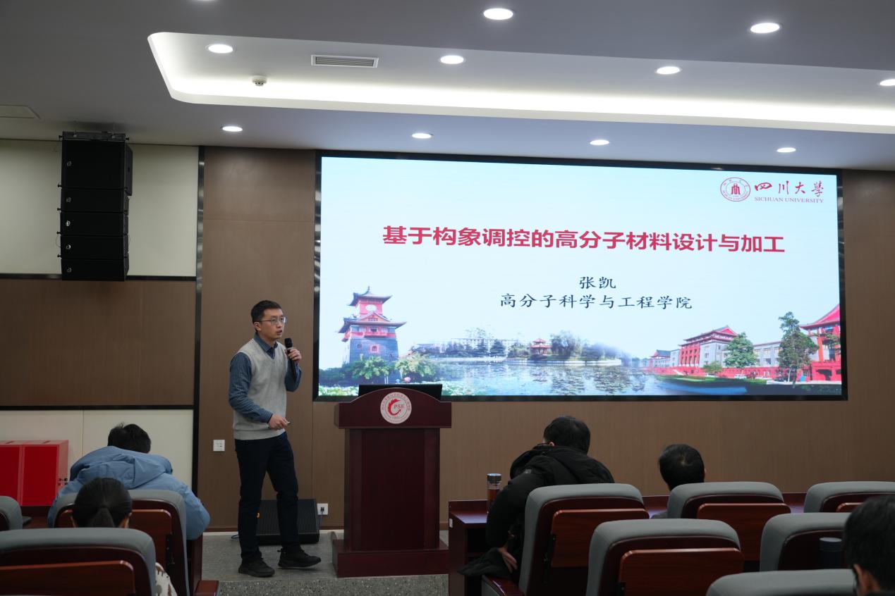 张凯作了题为“基于构象调控的高分子材料设计与加工”的报告,聚焦高分子材料的构象调控及其对材料性能的影响。他指出,随着高分子材料广泛应用于能源、信息、航空航天和生物医学等领域,其功能性日益重要,而高分子链构象在材料功能性实现中发挥着关键作用。报告详细探讨了通过“内场”调控高分子链构象优化材料性能的策略。以聚苯乙烯(PS)为例,他揭示了小分子与PS之间的不同π-π相互作用如何诱导形成特定构象(如反式和旁氏),从而改变材料性能。同时,他提出了“Polymer Cage”机理,并探讨了构象调控在实际加工中的应用潜力,为高分子材料的精细化加工与功能化设计提供了新思路。