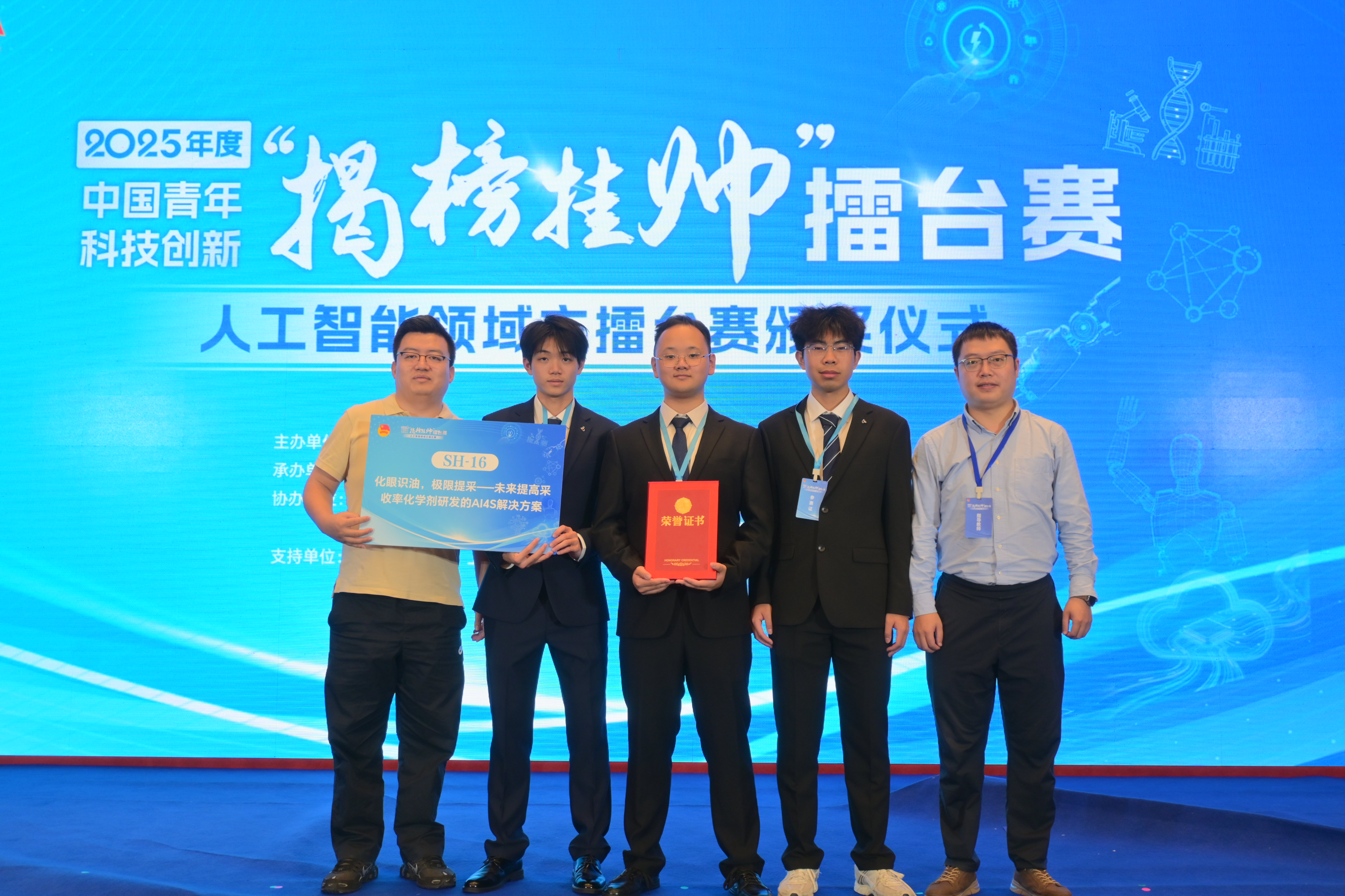 公司2023级本科生时殷飞、唐甫易、范丞轩共同完成的参赛项目“分子智构,微乳破界—AI赋能中相微乳液极限提采方案高效构建”(指导老师:赵学之、陈昊、冯玉军)从众多参赛队伍中脱颖而出,荣获全国一等奖。该团队也是“SH-16”榜题中唯一的全本科生团队。项目深度融合人工智能与化学驱提高采收率技术,针对中相微乳液研发难点,创新性地提出了“AI赋能”的中相微乳液驱配方智能设计新范式,推动驱油化学剂的研发迈入智能化、高效化的新阶段。