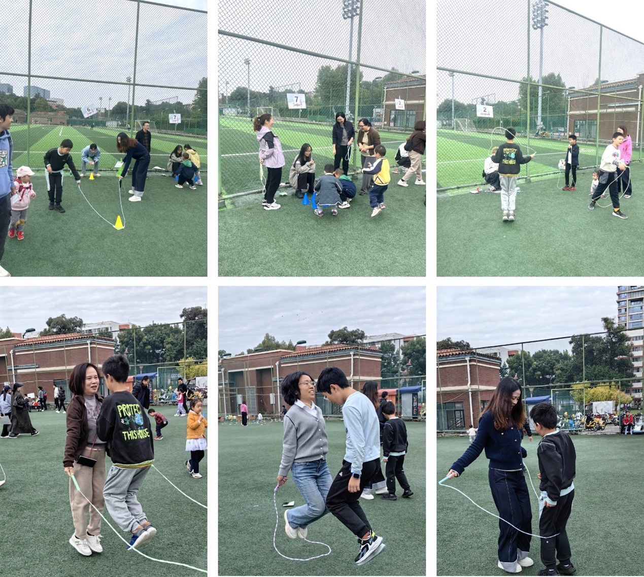 随后,“绳奇大冒险”环节正式开启。家长与孩子们携手挑战了“亲子跳绳接力赛”“60秒速度赛”“双人同步跳”“跳大绳”“趣味解绳”“移树换叶”“跳跃寻宝”“两人三足走”等八大关卡。孩子们在家长的陪伴与鼓励下,勇敢尝试、默契配合,不仅锻炼了身体协调性与反应能力,更在合作中学会了沟通与信任。每个项目完成后,家庭可获得套圈作为奖励,激发了孩子们的参与热情与成就感。