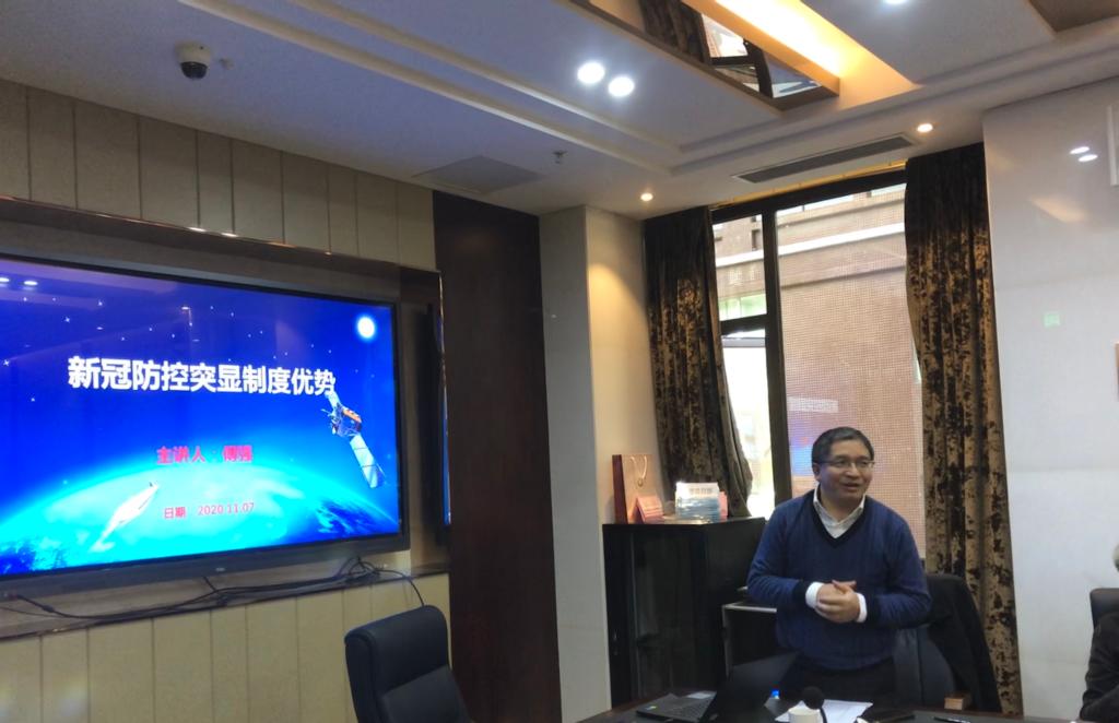 随后,学院经理傅强同志给全体党员做 “新冠防控突显制度优势”的党课,强调指出国家防控工作取得的成效,再次彰显了中国共产党领导和中国特色社会主义制度的显著优势,而党的领导是打赢疫情防控阻击战的坚强政治保证。全体党员、党员积极分子要增强“四个意识”、坚定“四个自信”、做到“两个维护”, 进一步锤炼宗旨意识,牢记初心使命,践行党的路线,为推进新时代学科发展做出积极贡献。