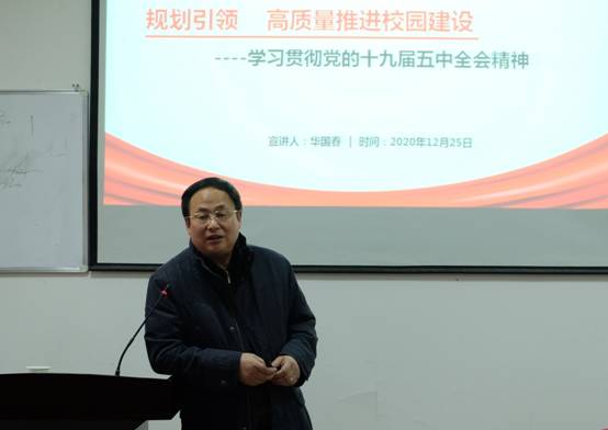 为深入学习宣传贯彻党的十九届五中全会精神,12月25日下午,金沙js5588邀请校宣讲团成员、基建处处长华国春为公司师生带来了题为“规划引领 高质量推进校园建设——学习贯彻党的十九届五中全会精神”的宣讲报告。报告会由公司党委副书记钱祉祺主持,参会人员有学院两委委员、支委委员等。