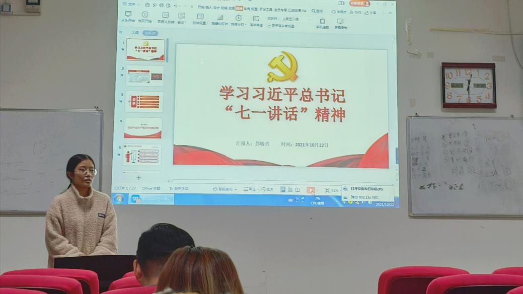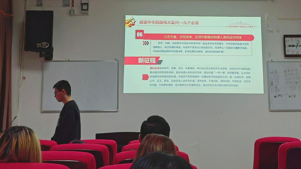 随后,支部党员代表彭敏哲同志以“学习习近平总书记 '七一' 讲话精神”为题,从“回顾中国共产党百年光辉历程”、“诠释中国共产党的伟大建党精神”、“展望中华民族伟大复兴九个必须”、“寄语广大青年”和“号召全体中国共产党员”五个方面深刻阐述了习近平总书记“七一”重要讲话的重大意义、主要内容和丰富内涵。