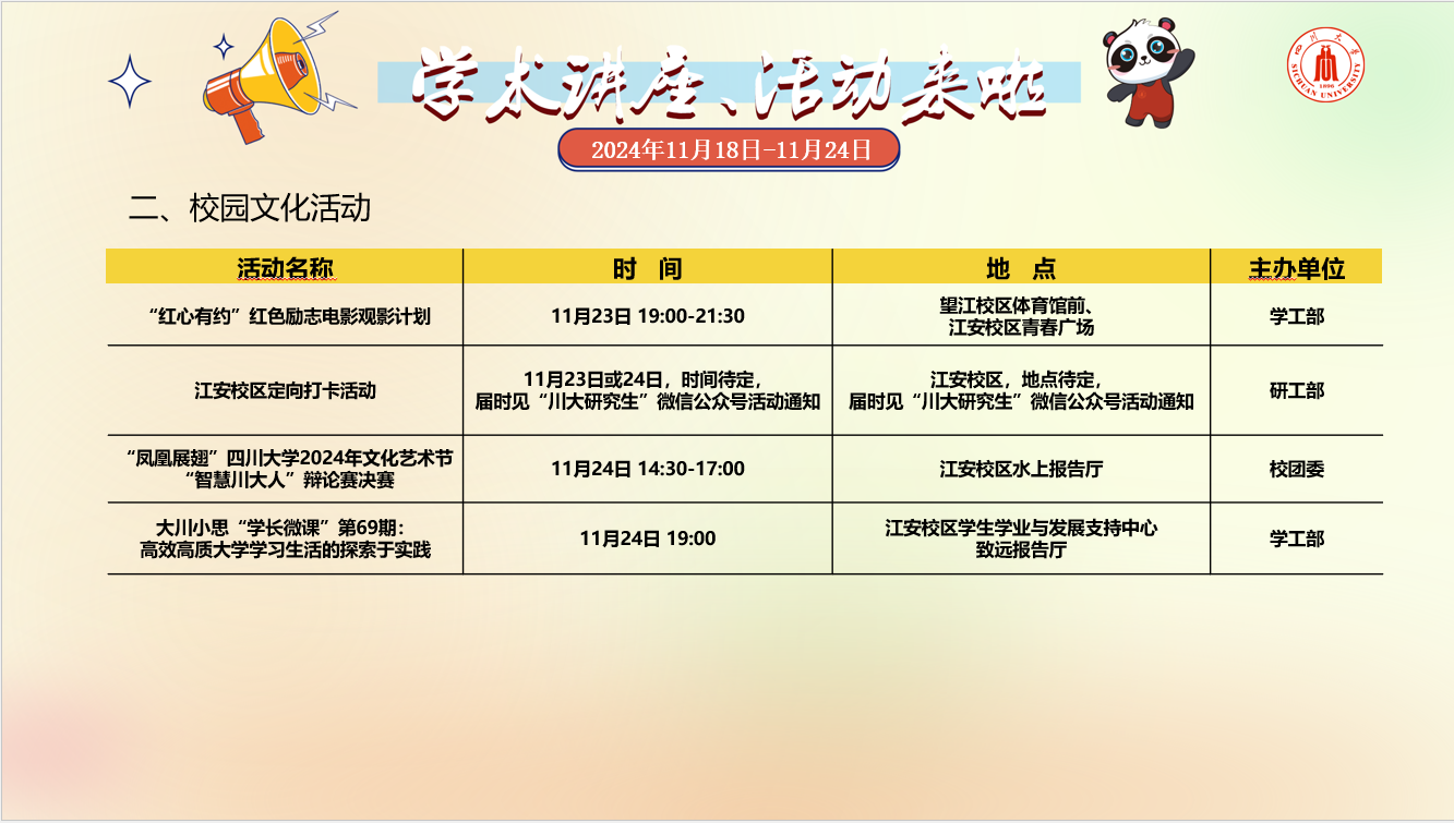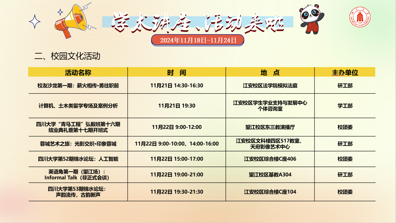 学术讲座论坛及校园文化活动预告 (2024年11月18日-11月24日)