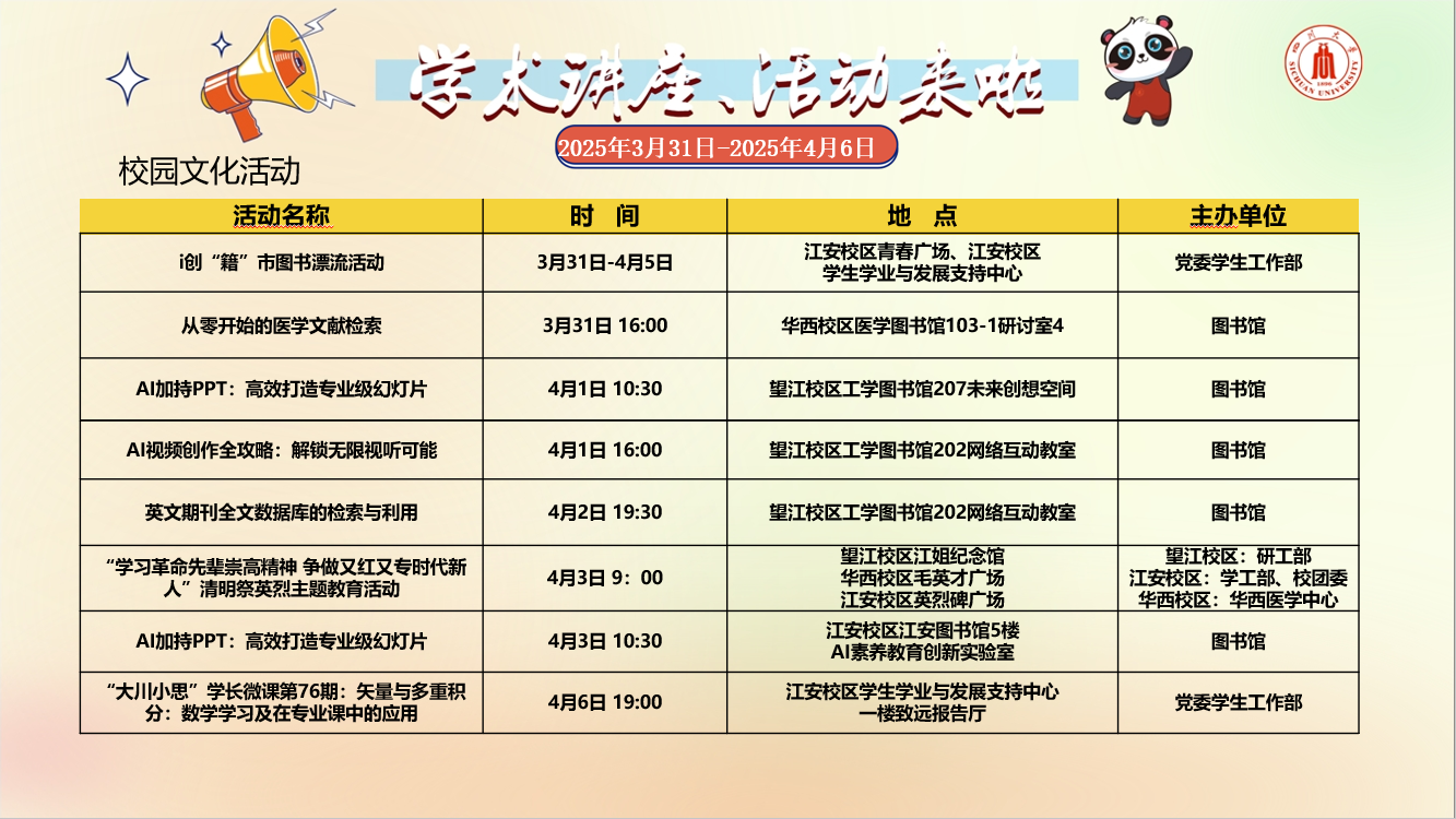 学术讲座及校园文化活动预告(3月31日-4月6日)