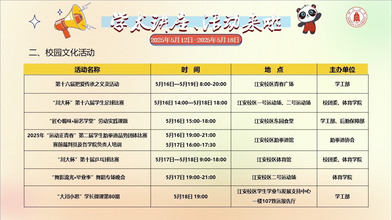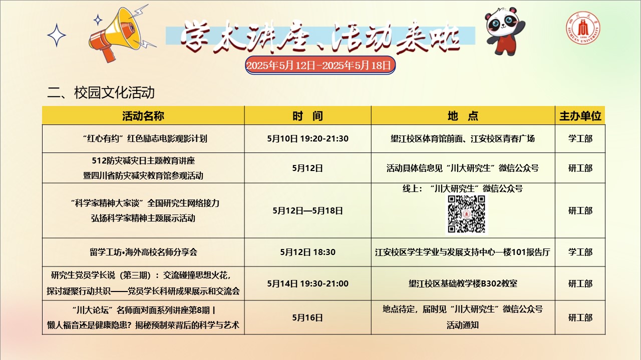 学术讲座论坛及校园文化活动预告(2025年5月12日-2025年5月18日)