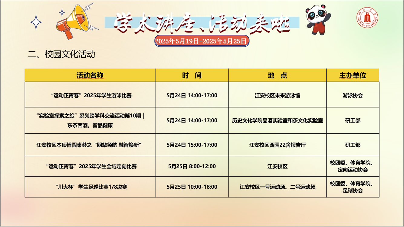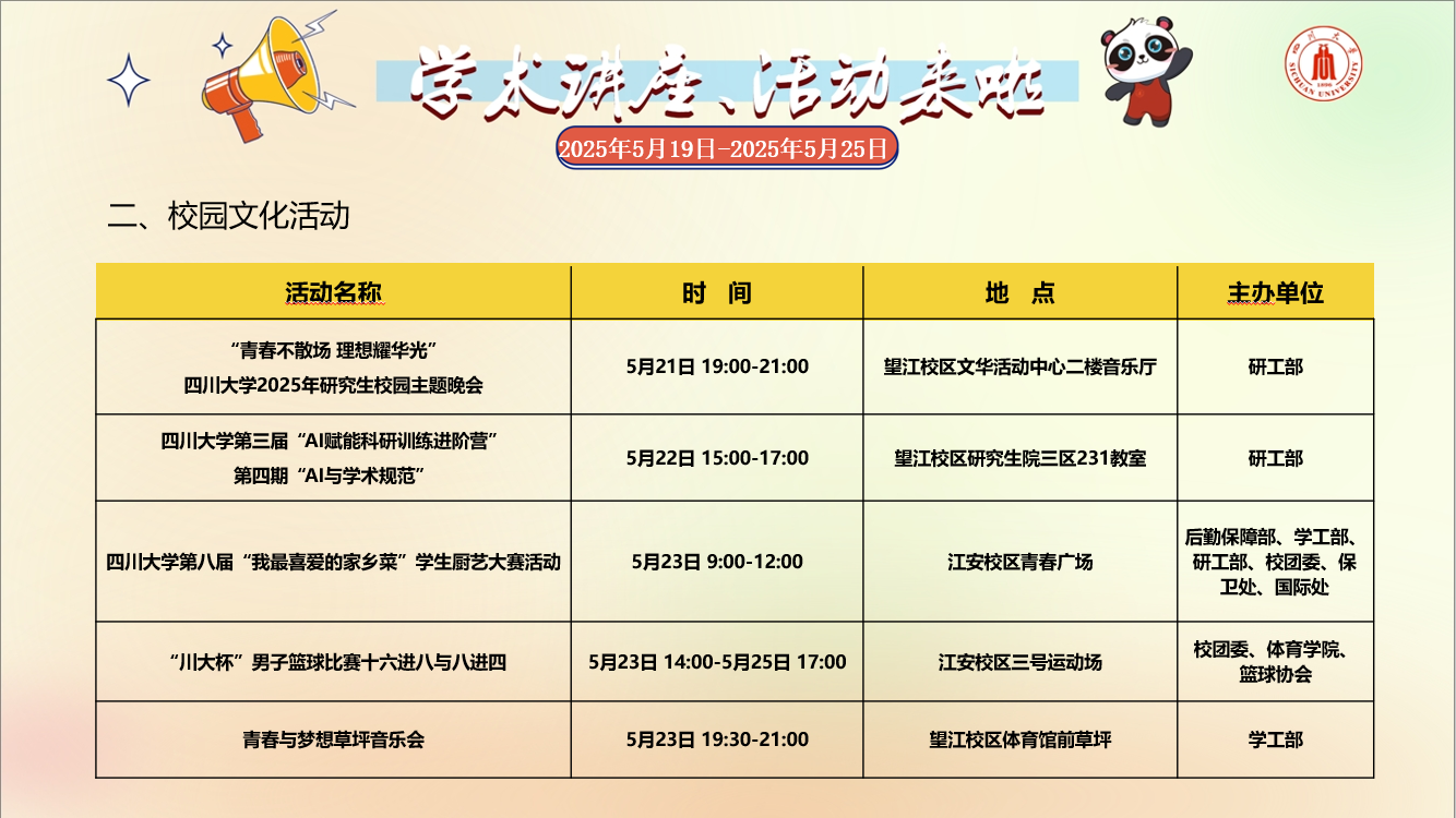 学术讲座论坛及校园文化活动预告(2025年5月19日-2025年5月25日)