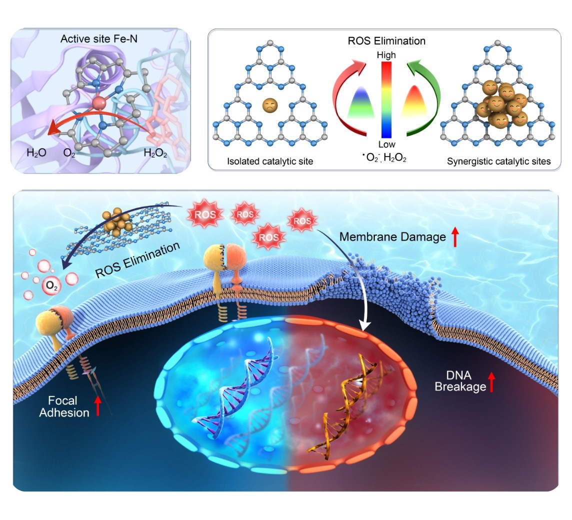 生命系统中过量产生的活性氧(ROS),包括过氧化氢(H2O2)、超氧阴离子(O2-)、羟基自由基(·OH)和单线态氧(1O2),会导致DNA损伤、蛋白质变性、脂质过氧化和其他生物分子失活,进而导致有害的细胞功能障碍、组织再生障碍,甚至难治性慢性疾病,如神经创伤、心肌梗死、类风湿性关节炎、骨缺损和糖尿病等。如今,为了对抗各种疾病中的氧化应激,特别是基于干细胞的生物疗法,天然抗氧化酶因其高度的特异性和催化活性而被广泛用作清除ROS的有效生物催化剂。然而创制兼具高催化活性及稳定性的类过氧化氢酶材料极具挑战性,也是实现干细胞在炎性损伤病变部位治疗的关键,这一领域目前还未见突破性研究进展。