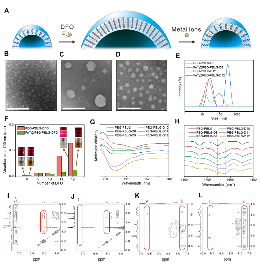 该团队通过调节DFO的接枝数,调节了侧链DFO的氢键密度,并通过DFO之间的短程相互作用对聚氨基酸主链骨架进行几何约束,从而促使聚氨基酸的二级构象发生由α-螺旋向β-折叠的转变以及囊泡粒径的显著增加。