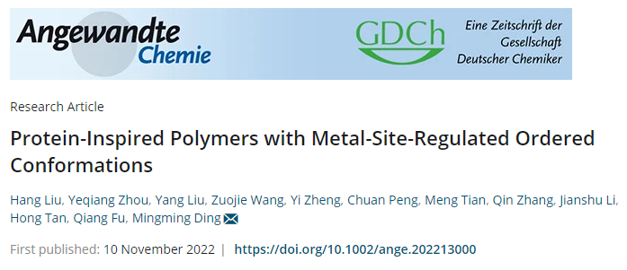近日,公司丁明明教授团队在Angewandte Chemie International Edition期刊上发表了题为“Protein-Inspired Polymers with Metal-Site-Regulated Ordered Conformations”的学术论文。刘航和周业强为本文共同第一作者,丁明明教授为通讯作者,第一单位为金沙js5588。
