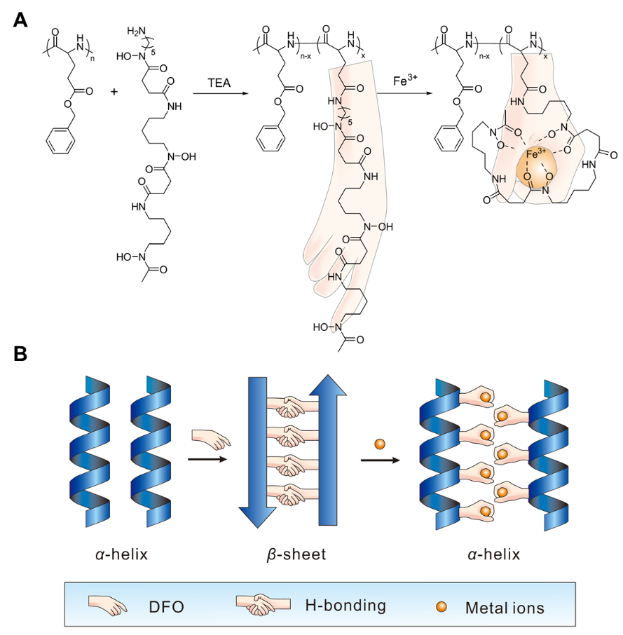 丁明明教授团队开发了一种通过金属离子介导聚氨基酸二级结构有序转变的新策略。该策略通过合理设计,将螯合分子去铁胺(DFO)接枝在聚氨基酸侧链,并通过调节配体数量以及螯合金属离子,实现了聚氨基酸自组装体二级构象的有序-有序和可控转变。