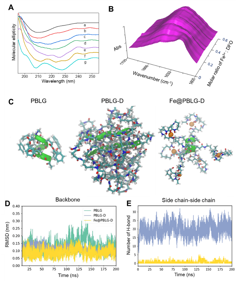 在进一步的研究中,该团队通过DFO与Fe3+等金属离子的配位过程,解除了聚氨基酸侧链上DFO分子对聚氨基酸主链的约束作用,从而实现了依赖于铁浓度的从β-折叠向α-螺旋构象的转变。作者通过二维核磁、红外和分子动力学模拟等手段揭示了金属配位调控聚氨基酸有序构象的分子机制。