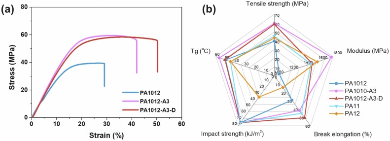 PA1012是一种我国可自主生产的半生物来源的长碳链聚酰胺,其力学性能可与PA12和PA11相媲美。然而,将PA1012用于PBF-LB/P技术主要面临加工窗口窄(对设备控温要求较高)、成型温度高(导致后缩聚老化严重)等关键挑战。受聚酰胺纺丝工艺启发,公司李光宪教授/黄亚江教授团队创新性地利用金属离子-高分子络合相互作用优化了自研PA1012粉末的加工行为和烧结制件的机械性能。研究发现,廉价的金属卤化物(CaCl2)显著改善了PA1012粉末的表面形貌和粉体流变行为、延缓/抑制了熔体结晶、大幅拓宽了粉末的烧结成型窗口。对PA1012粉末用3wt%的CaCl2改性后,烧结制件成型精度得到明显改善,拉伸强度、拉伸模量和断裂伸长率分别提高了51%、67%和43%,达到甚至超过了商品PA12和PA11粉末烧结制品的力学性能水平。同时,改性PA1012粉末在加工中的后缩聚老化反应得到了明显抑制,复用率得到改善。该研究从多价金属离子“交联点”破坏分子间氢键、限制高分子链运动性等微观角度,首次阐明了金属离子-高分子络合作用在优化粉末的成型性能和烧结制件的结构-性能关系中的巨大潜力,为拓宽PBF-LB/P加工技术的材料来源提供了新的思路。