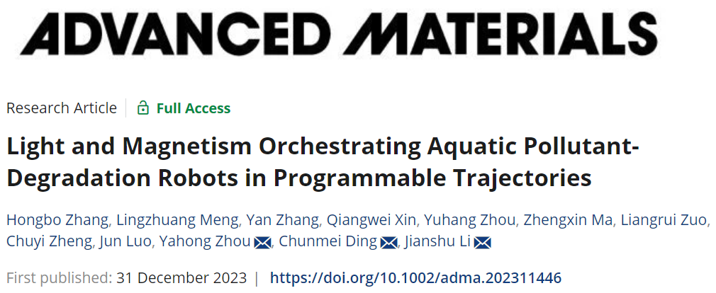 该工作以“Light and magnetism orchestrating aquatic pollutant-degradation robots in programmable trajectories”为题发表在《Advanced Materials》上,第一作者为公司2023级博士研究生张鸿博。共同通讯作者为公司丁春梅副教授/李建树教授和中科院理化所周亚红副研究员。该研究成果已授权中国发明专利(专利号:ZL202210900642.1)。该项工作得到国家自然科学基金(基金号:52373295,51925304,21988102,52273135),中国科学院青年创新促进会(Grant NO. 2021029)和高分子材料工程国家重点实验室(Grant No.:sklpme 2023-2-02)的支持。
