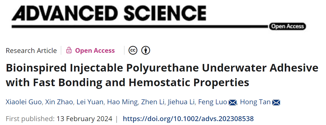 该工作以“Bioinspired Injectable Polyurethane Underwater Adhesive with Fast Bonding and Hemostatic Properties”为题发表在《Advanced Science》上,通讯作者为公司谭鸿教授和罗锋副研究员。该项工作得到国家自然科学基金重点项目(U1930204),国家自然科学基金(51873117),四川省科技计划项目(2022NSFSC0375),金沙js5588Med-X材料中心创新计划(MCMGD202304)和高分子材料工程国家重点实验室(sklpme2202-07)的支持。