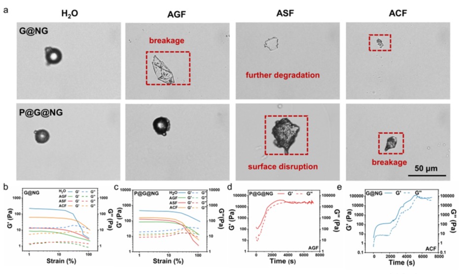 微胶囊必须能够抵抗恶劣的胃肠道环境,以实现在不同消化液中的多级降解递送NO。通过体外消化液模拟多级NO递送微胶囊口服给药后在胃肠道中的降解性。聚多巴胺涂层包覆的微胶囊在不同消化液处理后形貌以及模量都比较稳定,能够抵御胃酸和胆碱。经多级NO递送微胶囊治疗的结肠炎小鼠结肠损伤程度与疾病组相比显著改善。