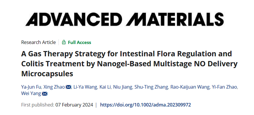 近日,杨伟教授团队开发了基于纳米凝胶的多级NO释放微胶囊,利用NO的抗菌性实现对于肠道菌群的调节,从而减轻炎症和促进肠道屏障修复。微胶囊能够保护纳米凝胶耐消化液到达结肠部位,纳米凝胶通过透明质酸与CD44作用靶向结肠炎症,原位反应释放NO抑制致病菌的生长,增加益生菌的数量。肠道益生菌的增加促进短链脂肪酸和吲哚衍生物的产生,通过激活白细胞介素-17(IL-17)和PI3K-Akt信号通路调节肠道免疫力并恢复肠道屏障。相关工作以“A Gas Therapy Strategy for Intestinal Flora Regulation and Colitis Treatment by Nanogel-Based Multistage NO Delivery Microcapsules”为题发表在Advanced Materials,论文的第一作者为博士研究生傅雅君,通讯作者为杨伟教授和赵星博士后。该研究得到国家自然科学基金(NNSFC 52125301)、四川省自然科学基金(NSFSC 2023NSFSC1584)、金沙js5588材料Med-X中心Med-X创新计划(批准号:MCM202305)和金沙js5588博士后跨学科创新基金(批准号:JCXK2202)的资助。