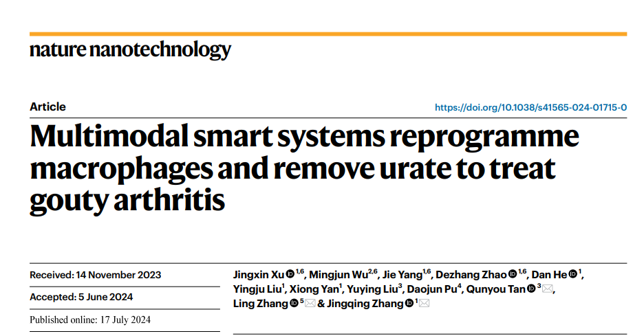 张凌研究员课题组继2023年在国际知名学术期刊《Signal Transduction and Targeted Therapy》发表类风湿关节炎靶向治疗研究成果(Metabolic reprogramming of proinflammatory macrophages by target delivered roburic acid effectively ameliorates rheumatoid arthritis symptoms.https://www.nature.com/articles/s41392-023-01499-0,DOI: 10.1038/s41392-023-01499-0)以后,与重庆医科大学张景勍教授、谭群友教授团队合作,7月17日在国际著名学术期刊Nature Nanotechnology发表了题为“Multimodal smart systems reprogramme macrophages and remove urate to treat gouty arthritis”的痛风性关节炎靶向治疗研究论文。