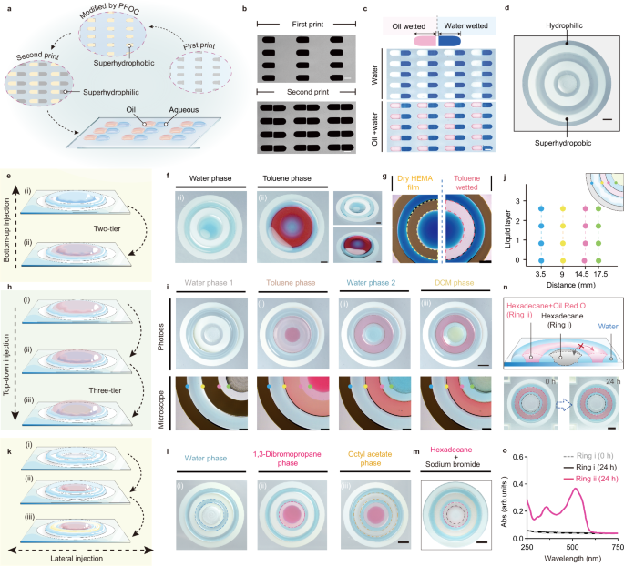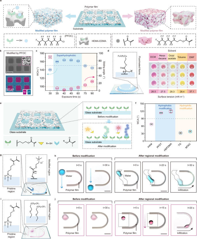 聚合物芯片成功打印后,表面不同区域具有不同的活性反应位点。在多孔聚合物结构中,HEMA单体的本征羟基作为后续化学转化的锚定位点,例如,在三乙胺存在下可进行酯化反应,从而在多孔聚合物薄膜表面接枝全氟辛酰氯以实现聚合物图案的超疏水性能。除此以外,通过利用聚合物基质内的残余烯烃基团作为聚合位点,利用基于DMD的投影光源进行局部辐照,以引发全氟己基乙基甲基丙烯酸酯单体在聚合物膜孔内聚合,获得具有疏油性能的聚合物图案,提升了聚合物芯片处理有机液滴的能力。值得注意的是,修饰后的超疏水(疏油)聚合物芯片仍然具有良好的机械性能。同时,玻璃基底表面接枝的3- (甲基丙烯酰氧基) 丙基三甲氧基硅烷也保留其反应活性,以便使用硫醇-烯烃光点击化学对玻璃区域进行后续化学修饰。