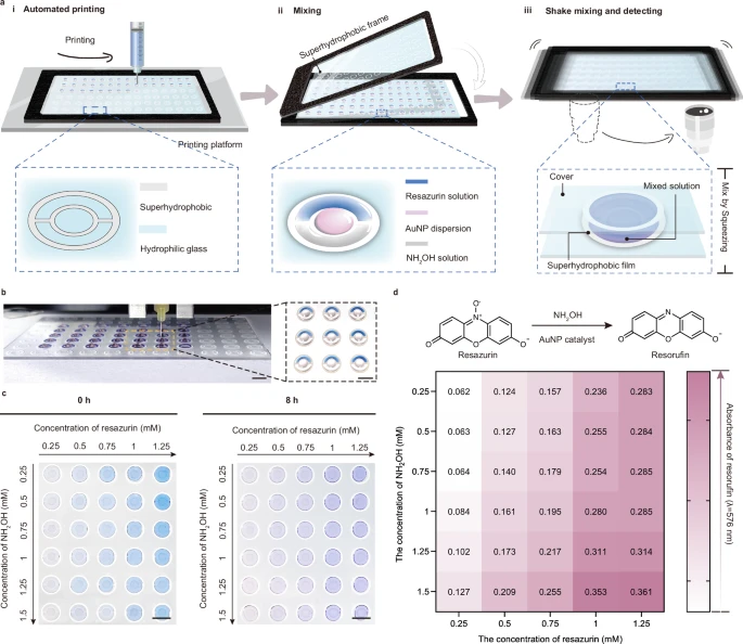 为了提高复杂合成的精准性,通过引入机器辅助液滴操作,实现加液-反应-检测-数据收集这一流程的自动化。该方法能够打印大部分水性以及有机溶剂的液滴阵列,具有良好的均匀性和稳定性。该机器辅助打印能够在打印聚合物芯片形成液滴的垂直和横向堆叠结构,并且能够根据程序而调节打印顺序,显示了该芯片应用于机器辅助系统下执行组合化学的可能性。通过在搭建的高通量液滴系统的反应模型中使用不同反应物浓度的金纳米颗粒以催化羟胺还原刃天青反应,验证了该体系的三个关键方面:机器辅助分别加载不同的反应组分,一步启动所有平行反应,以及在反应过程中程序化的机器振荡和每个反应单元的实时监控。